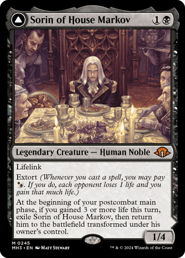 A transforming double-faced card enters the battlefield with its front face up by default, unless a spell or ability instructs you to put it onto the battlefield transformed or allows you to cast it transformed, in which case it enters with its back face up. — Each face of a transforming double-faced card has its own set of characteristics: name, types, subtypes, abilities, and so on. While a transforming double-faced permanent is on the battlefield, consider only the characteristics of the face that's currently up. The other set of characteristics is ignored. — Each transforming double-faced card in this set is cast with its front face up. In every zone other than the battlefield, consider only the characteristics of its front face. If it is on the battlefield, consider only the characteristics of the face that's up; the other face's characteristics are ignored. — If you are instructed to put a card that isn't a double-faced card onto the battlefield transformed, it will not enter the battlefield at all. In that case, it stays in the zone it was previously in. For example, if a single-faced card is a copy of Ral, Monsoon Mage, choosing to exile that permanent during the resolution of its triggered ability will cause it to remain in exile. — In some rare cases, a spell or ability may cause Sorin of House Markov to transform while he's a creature (front face up) on the battlefield. If this happens, Sorin, Ravenous Neonate won't have any loyalty counters on him and will subsequently be put into his owner's graveyard. — In the Commander variant, a double-faced card's color identity is determined by the mana costs and mana symbols in the rules text of both faces combined. If either face has a color indicator or basic land type, those are also considered. For example, Ral, Monsoon Mage's color identity is blue and red, since its front face is red and its back face has a blue and red color indicator. — Sorin of House Markov doesn't need to have been on the battlefield when you gained the life. For example, if you gained 3 or more life during your upkeep and you cast Sorin of House Markov during your first main phase, its last ability will trigger at the beginning of your postcombat main phase. — Sorin of House Markov's last ability will trigger only once during your postcombat main phase, no matter how much life you gained this turn. However, if you haven't gained life so far this turn as your postcombat main phase begins, the ability won't trigger at all. It's not possible to gain life during your postcombat main phase in time for the ability to trigger. — Sorin, Ravenous Neonate's second loyalty ability counts the total amount of life you gained without taking into account any life you lost during that turn. For example, if you gained 3 life and lost 3 life earlier in the turn, Sorin, Ravenous Neonate will deal 3 damage to the target. — The amount of life you gain from extort is based on the total amount of life lost, not necessarily the number of opponents you have. For example, if your opponent's life total can't change (perhaps because that player controls Platinum Emperion), you won't gain any life. — The back face of a transforming double-faced card usually has a color indicator that defines its color. Colorless back faces, such as lands, do not. — The control effect created by Sorin, Ravenous Neonate's last ability lasts indefinitely. It doesn't wear off during the cleanup step or if Sorin, Ravenous Neonate leaves the battlefield. — The extort ability doesn't target any player. — The mana value of a transforming double-faced card is the mana value of its front face, no matter which face is up. — You can activate one of Sorin, Ravenous Neonate's loyalty abilities the turn he enters the battlefield. However, you may do so only during one of your main phases when the stack is empty. For example, if you control another permanent with an ability that triggers at the beginning of your postcombat main phase and that ability is on the stack below Sorin of House Markov's last ability, there will be an opportunity for your opponent to remove Sorin, Ravenous Neonate before you can activate one of his abilities. — You may pay {W}{B} a maximum of one time for each extort triggered ability. You decide whether to pay when the ability resolves. — Food is an artifact type. Even though it appears on some creatures, it's never a creature type. — Whatever you do, don't eat the delicious cards. — You can't sacrifice a Food to pay multiple costs. For example, you can't sacrifice a Food token to activate its own ability and also to activate Maraleaf Rider's ability.