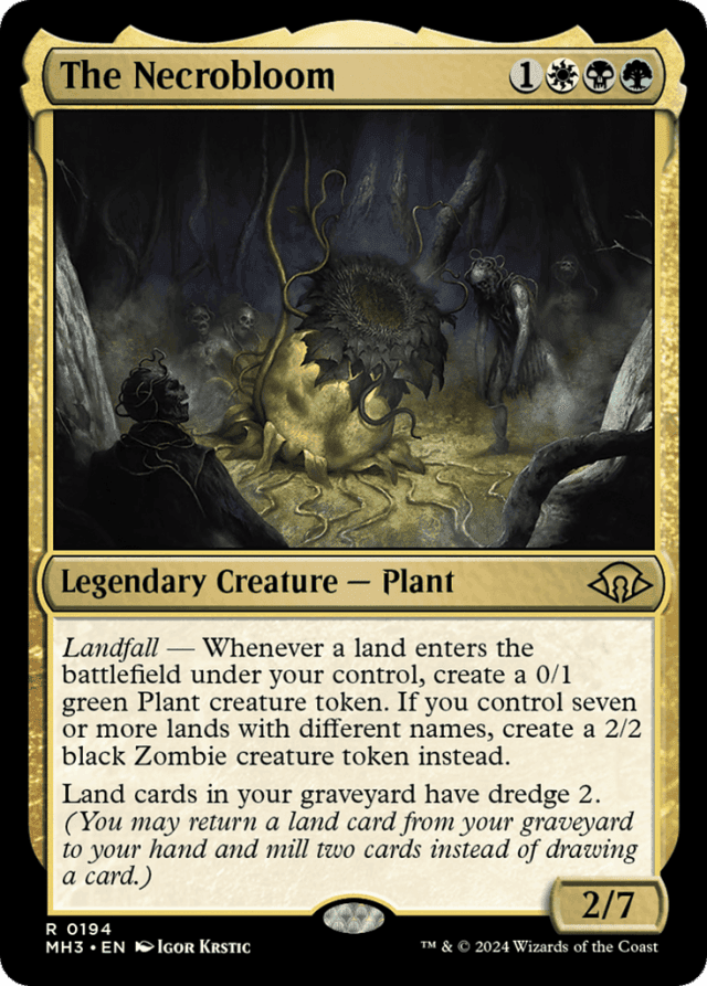 Landfall — Whenever a land you control enters, create a 0/1 green Plant creature token. If you control seven or more lands with different names, create a 2/2 black Zombie creature token instead. Land cards in your graveyard have dredge 2. (You may return a land card from your graveyard to your hand and mill two cards instead of drawing a card.)