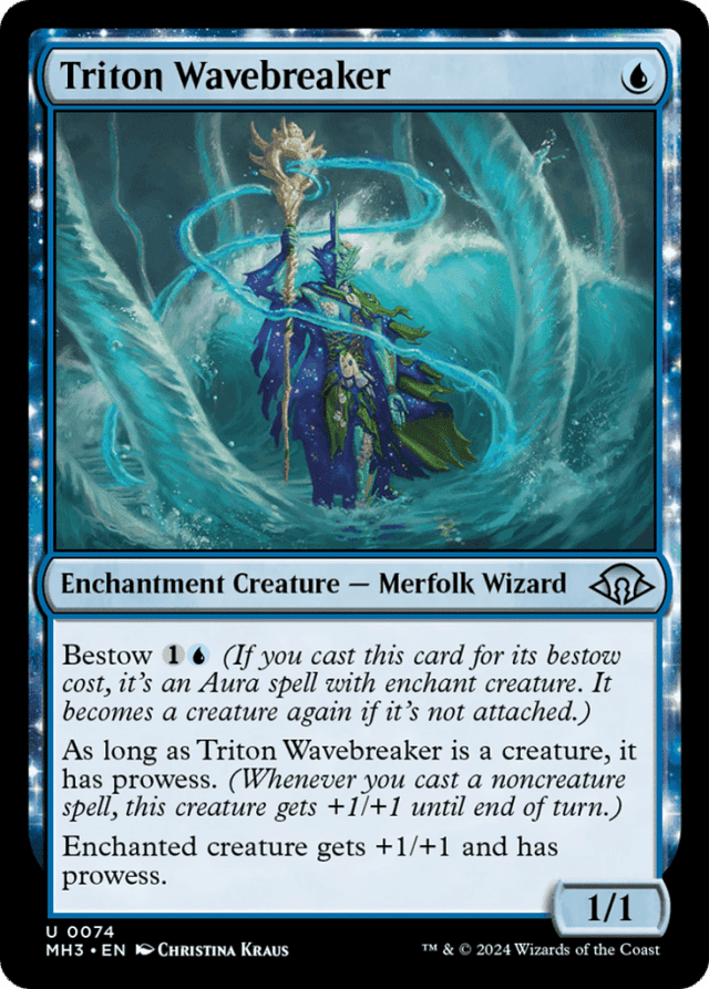 Bestow {1}{U} (If you cast this card for its bestow cost, it's an Aura spell with enchant creature. It becomes a creature again if it's not attached.) As long as this permanent is a creature, it has prowess. (Whenever you cast a noncreature spell, this creature gets +1/+1 until end of turn.) Enchanted creature gets +1/+1 and has prowess.