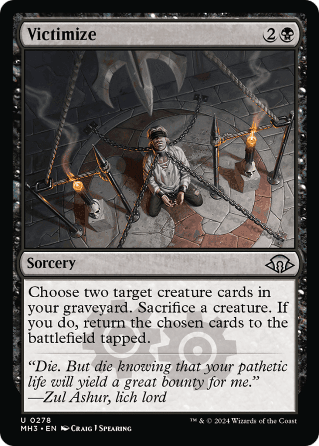 As Victimize resolves, you must sacrifice a creature if able. You can't change your mind and choose not to sacrifice anything. — If one of the targeted creature cards is an illegal target (for instance, because it has left your graveyard before Victimize resolves), you'll still sacrifice a creature and put the other card onto the battlefield. If both are illegal targets, Victimize won't resolve. You won't sacrifice a creature. — The creature you sacrifice isn't chosen until Victimize resolves. You can't return the creature you sacrifice because it will still be on the battlefield at the time targets are chosen. — You must choose two targets. You can't cast Victimize targeting only one creature card.