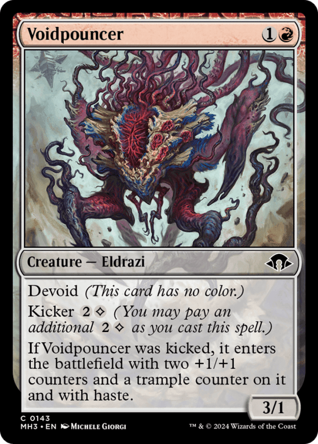 Devoid (This card has no color.) Kicker {2}{C} (You may pay an additional {2}{C} as you cast this spell.) If this creature was kicked, it enters with two +1/+1 counters and a trample counter on it and with haste.