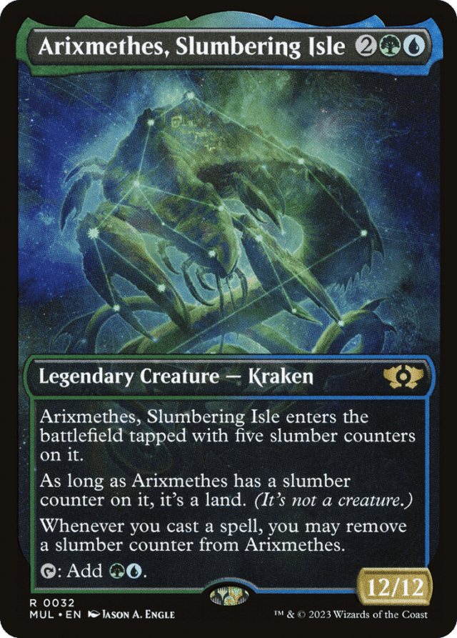 Arixmethes enters tapped with five slumber counters on it. As long as Arixmethes has a slumber counter on it, it's a land. (It's not a creature.) Whenever you cast a spell, you may remove a slumber counter from Arixmethes. {T}: Add {G}{U}.
