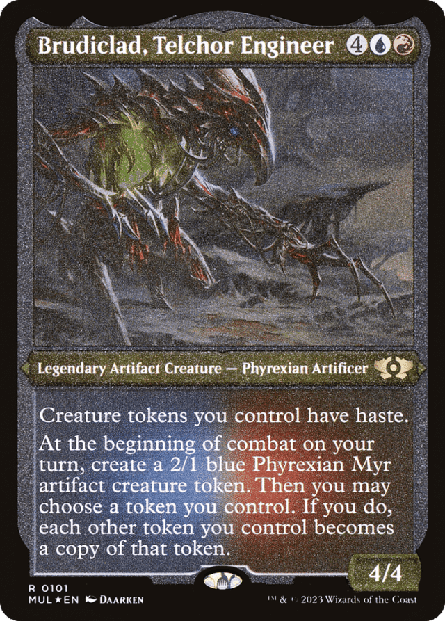 All other tokens you control become a copy of the chosen token, even those that aren't of the same type. For example, if you control a Treasure artifact token and choose the Myr token Brudiclad just created, your Treasure will become a copy of the Myr. — Brudiclad copies only the values defined as the original token was created (unless that token is copying something else; see below). It doesn't copy whether that token is tapped or untapped, whether it has any counters on it or any Auras and Equipment attached to it, or any non-copy effects that have changed its power, toughness, types, color, or so on. — If the chosen token is copying something else (for example, if the chosen token was previously affected by Brudiclad's triggered ability), then your tokens become copies of whatever the chosen token copied. — The effect of Brudiclad's triggered ability lasts indefinitely. It continues to apply after Brudiclad leaves the game. — The last effect of Brudiclad's triggered ability affects all tokens you control other than the chosen token, including the token that was just created if that isn't the chosen token. — Once a creature token that came under your control this turn has legally attacked, causing it to lose haste by removing Brudiclad from the battlefield won’t cause that token to stop attacking.