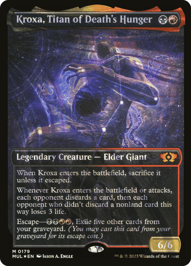 After an escaped spell resolves, it returns to its owner's graveyard if it's not a permanent spell. If it is a permanent spell, it enters the battlefield and will return to its owner's graveyard if it dies later. Perhaps it will escape again—good underworld security is so hard to come by these days. — An opponent loses 3 life if they discard a land card or if they can't discard a card at all. — As the second ability resolves, first the next opponent in turn order (or, if it's an opponent's turn, the opponent whose turn it is) chooses a card in hand without revealing it, then each other opponent in turn order does the same. All the chosen cards are discarded at the same time, and then the appropriate players lose 3 life each. — Escape's permission doesn't change when you may cast the spell from your graveyard. — If a card has multiple abilities giving you permission to cast it, such as two escape abilities or an escape ability and a flashback ability, you choose which one to apply. The others have no effect. — If a card with escape is put into your graveyard during your turn, you'll be able to cast it right away if it's legal to do so, before an opponent can take any actions. — If you cast a spell with its escape permission, you can't choose to apply any other alternative costs or to cast it without paying its mana cost. If it has any additional costs, you must pay those. — Kroxa's first ability causes you to sacrifice it if you didn't cast it, or if it was cast using any permission other than an escape ability. — Kroxa's second ability triggers when it enters the battlefield, even if it didn't escape. — Once you begin casting a spell with escape, it immediately moves to the stack. Players can't take any other actions until you're done casting the spell. — To determine the total cost of a spell, start with the mana cost or alternative cost you're paying (such as an escape cost), add any cost increases, then apply any cost reductions. The mana value of the spell remains unchanged, no matter what the total cost to cast it was and no matter whether an alternative cost was paid. — To resolve Kroxa's second triggered ability in a multiplayer game, the next opponent in turn order (or, if it's an opponent's turn, the opponent whose turn it is) chooses a card in hand and sets it aside without revealing it. Then each other opponent in turn order does the same. Next, all chosen cards are revealed and discarded at the same time. Finally, each opponent who didn't discard a nonland card loses 3 life.