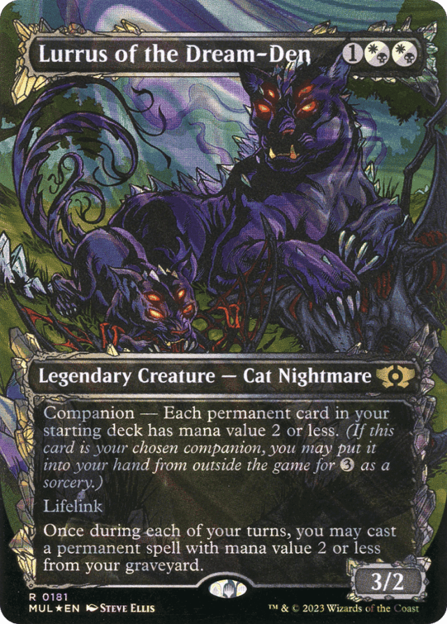 Before shuffling your deck to become your library, you may reveal one card from outside the game to be your companion if your starting deck meets the requirements of the companion ability. You can't reveal more than one. It remains revealed outside the game as the game begins. — For spells with {X} in their mana costs, use the value chosen for X to determine the spell's mana value. For example, if a permanent spell costs {X}{W}, you could cast it with X as 1 but not as 2. — If a card in a player's deck has {X} in its mana cost, X is considered to be 0. — If a permanent card is put into your graveyard during your main phase and the stack is empty, you have a chance to cast it before any player may attempt to remove that card from your graveyard. — If more than one player wishes to reveal a companion, the starting player does so first, and players proceed in turn order. Once a player has chosen not to reveal a companion, that player can't change their mind. — If you cast a spell from your graveyard using another permission, Lurrus's effect doesn't apply. You can cast another permanent spell from your graveyard. — If you cast one permanent spell from your graveyard and then have a new Lurrus come under your control in the same turn, you may cast another permanent spell from your graveyard that turn. — If you reveal a companion outside the game, for as long as it remains there, you may pay {3} any time you could cast a sorcery (that is, you have priority during your main phase and the stack is empty). Once you do, you put it into your hand and behaves like any other card you've brought into the game. For example, if it's discard, countered, or destroyed, it's put into your graveyard, remaining in the game. This is a change from previous rules. — Lurrus doesn't care about instant and sorcery cards in your starting deck. They may have any mana value. — Lurrus doesn't let you play lands from your graveyard. — Once you begin to cast the spell, losing control of Lurrus won't affect the spell. You can finish casting it as normal. — Paying {3} to put your companion into your hand is a special action. It doesn't use the stack and players can't respond to it. Once you take this action, you may cast that card if it's legal to do so before any other player can take actions. — The companion ability has no effect if the card is in your starting deck and creates no restriction on putting a card with a companion ability into your starting deck. For example, Zirda may be in your starting deck even if your other permanent cards don't all have activated abilities. — The companion's other abilities apply only if the creature is on the battlefield. They have no effect while the companion is outside the game. — The requirements of the companion ability apply only to your starting deck. They do not apply to your sideboard. — You may have one companion in the Commander variant. Your deck, including your commander, must meet its companion requirement. Your companion is not one of your one hundred cards. — You must follow the normal timing permissions and restrictions of the spell you cast from your graveyard. — You must pay the costs to cast that spell. If it has an alternative cost, such as a mutate cost, you may cast it for that cost instead. — Your companion begins the game outside the game. In tournament play, this means your sideboard. In casual play, it's simply a card you own that's not in your starting deck. — If you reveal a companion outside the game, for as long as it remains there, you may pay {3} any time you could cast a sorcery (that is, you have priority during your main phase and the stack is empty). Once you do, you put it into your hand and behaves like any other card you've brought into the game. For example, if it's discarded, countered, or destroyed, it's put into your graveyard, remaining in the game. This is a change from previous rules. — Once you put your companion into your hand, it behaves like any other card you’ve brought into the game. For example, if it’s countered or destroyed, it’s put into your graveyard, remaining in the game. — Paying {3} to put your companion into your hand is a special action. It doesn't use the stack and players can't respond to it. Once you take this action, you may cast that card if it's legal to do so before any other player can take actions. — Wizards of the Coast has issued functional errata for the Companion mechanic. Instead of casting companions from outside the game: Once per game, any time you could cast a sorcery (during your main phase when the stack is empty), you can pay {3} to put your companion from your sideboard into your hand. This is a special action, not an activated ability. It happens immediately and can’t be responded to. It can’t be countered or stopped by cards like Phyrexian Revoker. For more information please see https://magic.wizards.com/en/articles/archive/news/june-1-2020-banned-and-restricted-announcement