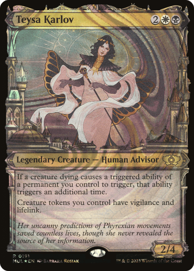 An ability of a permanent that triggers when a card is put into a graveyard “from anywhere” triggers twice only if Teysa and that permanent are both still on the battlefield immediately after the creature has died. — An ability that triggers on an event that causes a creature to die doesn't trigger twice. For example, an ability that triggers “whenever you sacrifice a creature” triggers only once. — An ability that triggers when a creature “leaves the battlefield” will trigger twice if that creature leaves the battlefield by dying. — If a creature dying at the same time as Teysa (including Teysa itself dying) causes a triggered ability of a permanent you control to trigger, that ability triggers an additional time. — If a creature dying at the same time that another permanent you control leaves the battlefield causes a triggered ability of that permanent to trigger, that ability triggers an additional time. — If you somehow control two Teysas, a creature dying causes abilities to trigger three times, not four. A third Teysa causes abilities to trigger four times, a fourth causes abilities to trigger five times, and so on. This also means that if you control Teysa and cast a second one, an ability that triggers when it dies due to the “legend rule” triggers three times. — Look at each creature as it exists on the battlefield, taking into account continuous effects, to determine whether any triggered abilities will trigger multiple times. For example, if a land that has become a creature dies, an ability that triggers when it dies triggers twice. — Teysa affects a creature's own “when this creature dies” triggered abilities as well as other triggered abilities that trigger when that creature dies. Such triggered abilities start with “when” or “whenever.” — Teysa's effect doesn't copy the triggered ability; it just causes the ability to trigger twice. Any choices made as you put the ability onto the stack, such as modes and targets, are made separately for each instance of the ability. Any choices made on resolution, such as whether to pay a cost for that triggered ability, are also made separately. — The trigger event doesn't have to specifically refer to “creatures.” In these cases, the trigger event may also refer to something being “put into a graveyard from the battlefield.” For example, an ability that triggers “whenever an artifact is put into a graveyard from the battlefield” would trigger twice if an artifact creature dies while Teysa Karlov is on the battlefield.