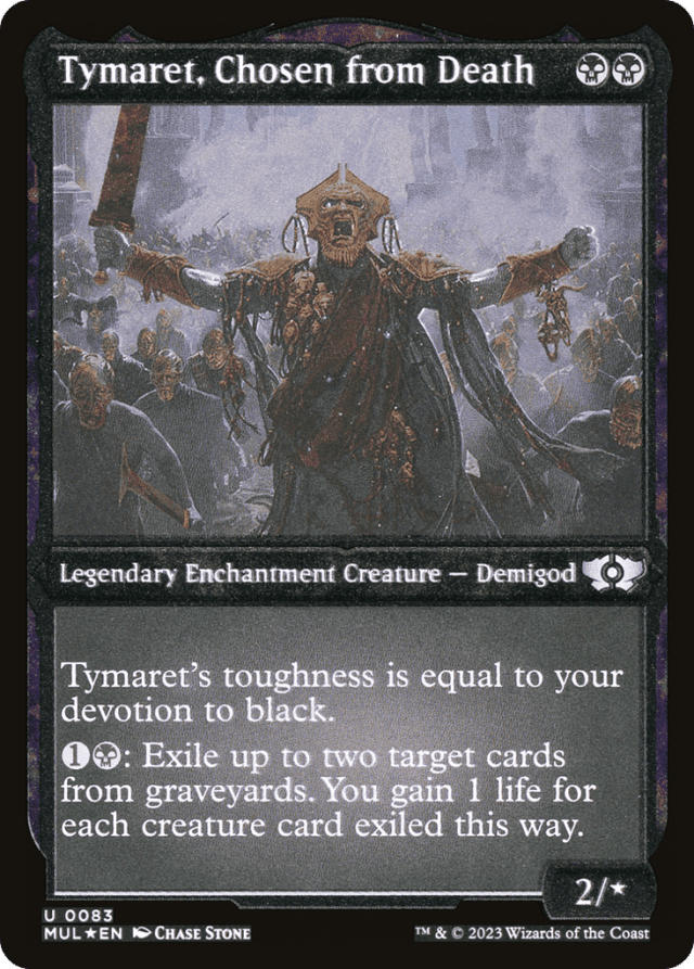 Tymaret's toughness is equal to your devotion to black. (Each {B} in the mana costs of permanents you control counts toward your devotion to black.) {1}{B}: Exile up to two target cards from graveyards. You gain 1 life for each creature card exiled this way.