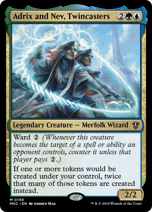 If a player casts a spell that targets multiple permanents their opponent controls with ward, each of those ward abilities will trigger. If that player doesn't pay for all of them, the spell will be countered. — Everything that is specified by the effect creating the original token or tokens will also be true about the additional token or tokens created by Adrix and Nev's replacement effect. For example, if an effect tells you to create a token "tapped and attacking" the additional tokens will also be tapped and attacking. Similarly, if an effect creates a token and puts counters on it (such as a Fractal token) the additional token will also get those counters.