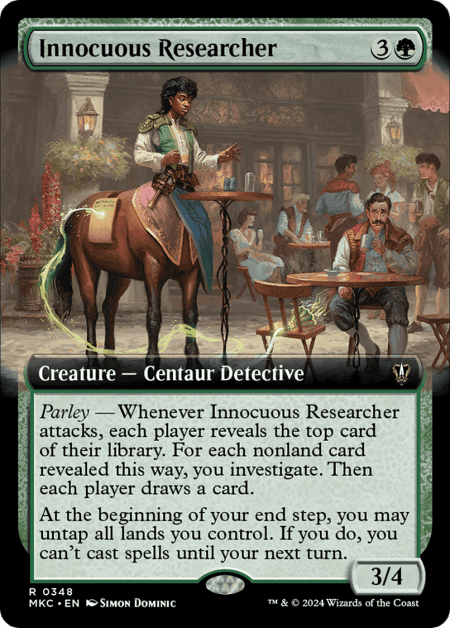 Parley — Whenever this creature attacks, each player reveals the top card of their library. For each nonland card revealed this way, you investigate. Then each player draws a card. At the beginning of your end step, you may untap all lands you control. If you do, you can't cast spells until your next turn.