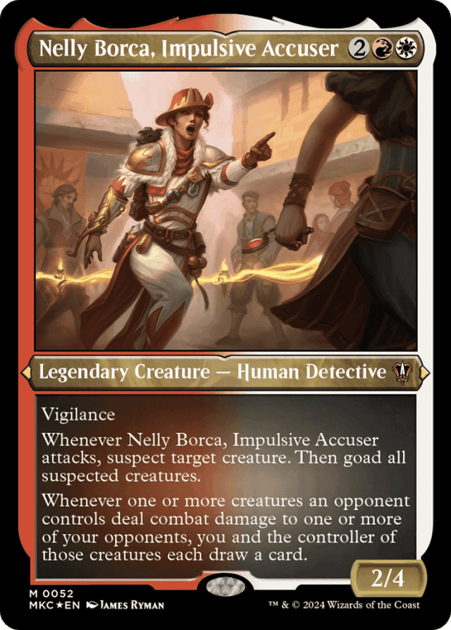 Vigilance Whenever Nelly Borca attacks, suspect target creature. Then goad all suspected creatures. (A suspected creature has menace and can't block.) Whenever one or more creatures an opponent controls deal combat damage to one or more of your opponents, you and the controller of those creatures each draw a card.