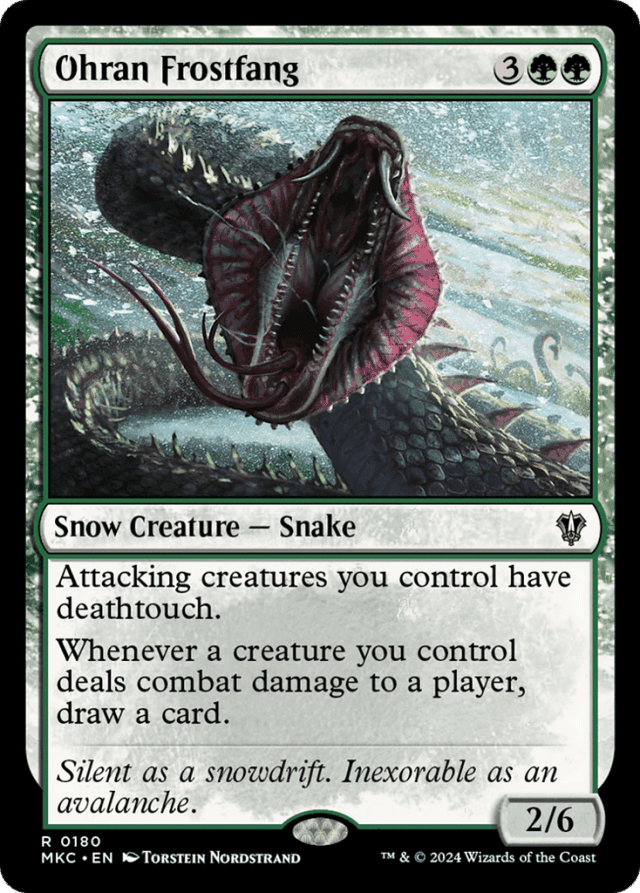 If one or more creatures you control deal combat damage to players at the same time that lethal damage is dealt to Ohran Frostfang, its ability triggers for each of those creatures. — Snow is a supertype, not a card type. It has no rules meaning or function by itself, but other cards and abilities may refer to it.