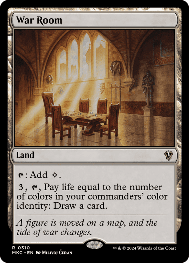 Color identity is set before the game begins and doesn't change during the game, even if your commander is in a hidden zone (like the hand or library) or an effect changes your commander's color. — If you don't have a commander, you can't activate War Room's last ability at all. — If your commander has no colors in its color identity, you pay no life to activate War Room's last ability.