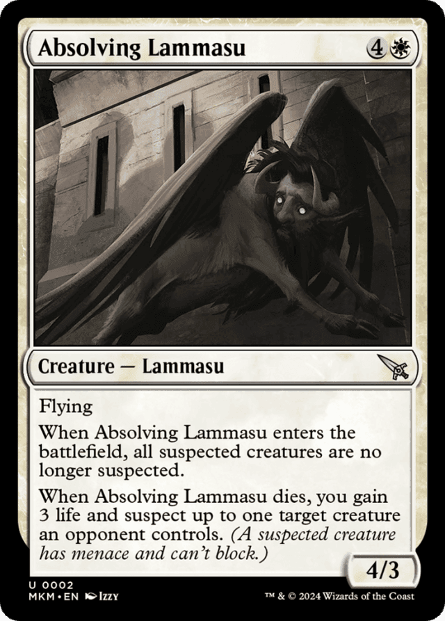 Being suspected isn't a copiable value. If a permanent becomes a copy of a suspected creature, it won't be suspected. — If a creature is already suspected, suspecting it again won't have any effect. — If a suspected creature loses all abilities, it will lose menace and "This creature can't block", but it won't stop being suspected. — There's no limit to the number of creatures that can be suspected simultaneously. Suspecting a new creature doesn't cause other creatures to stop being suspected. — When an effect suspects a creature, it becomes suspected. It gains menace and "This creature can't block" for as long as it's suspected. It stays suspected until it leaves the battlefield or another effect causes it to no longer be suspected. — You don't have to choose a target for Absolving Lammasu's last ability. However, if you do, and that permanent is an illegal target at the time the ability tries to resolve, it won't resolve and none of its effects will happen. You won't gain life.