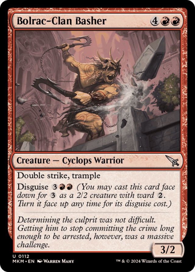 Double strike, trample Disguise {3}{R}{R} (You may cast this card face down for {3} as a 2/2 creature with ward {2}. Turn it face up any time for its disguise cost.)