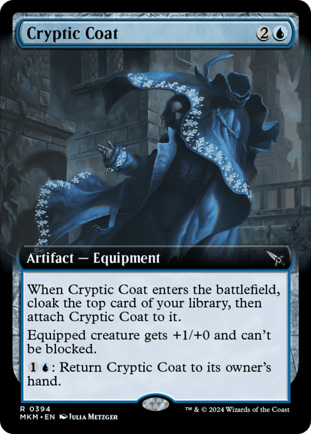 When this Equipment enters, cloak the top card of your library, then attach this Equipment to it. (To cloak a card, put it onto the battlefield face down as a 2/2 creature with ward {2}. Turn it face up any time for its mana cost if it's a creature card.) Equipped creature gets +1/+0 and can't be blocked. {1}{U}: Return this Equipment to its owner's hand.