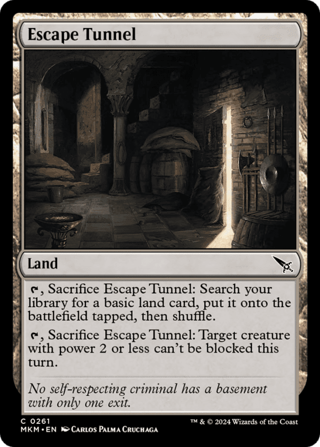 {T}, Sacrifice this land: Search your library for a basic land card, put it onto the battlefield tapped, then shuffle. {T}, Sacrifice this land: Target creature with power 2 or less can't be blocked this turn.