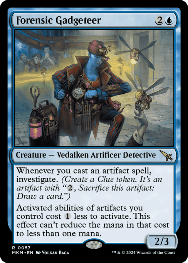 Activated abilities contain a colon. They're generally written "[Cost]: [Effect]." Some keywords are activated abilities and will have colons in their reminder text. Triggered abilities (starting with "when," "whenever," or "at") are unaffected by the cost reduction ability of Forensic Gadgeteer. — Clue is an artifact type. Even though it appears on some cards with other permanent types, it's never a creature type, a land type, or anything but an artifact type. — Forensic Gadgeteer's last ability affects only abilities of artifacts you control on the battlefield. The costs of activated abilities of artifact cards that work in other zones, such as cycling, won't be reduced. — If an effect refers to a Clue, it means any Clue artifact, not just a Clue artifact token. For example, you can sacrifice Wrench to pay for Alquist Proft, Master Sleuth's activated ability. — Some abilities trigger "whenever you sacrifice a Clue". Those abilities trigger whenever you sacrifice a Clue for any reason, not just to activate a Clue's activated ability. — Some spells and abilities that investigate may require targets. If each target chosen is an illegal target as that spell or ability tries to resolve, it won't resolve. You won't create any Clue tokens. — You can't sacrifice a Clue to pay multiple costs. For example, you can't sacrifice a Clue token to activate its own ability and also to activate Alquist Proft, Master Sleuth's ability.