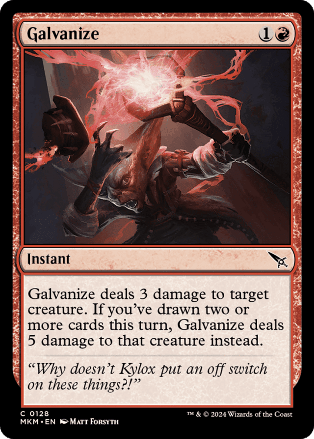 Galvanize deals 3 damage to target creature. If you've drawn two or more cards this turn, Galvanize deals 5 damage to that creature instead.