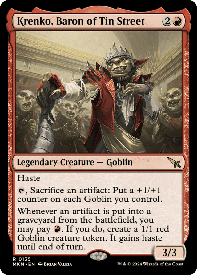 Haste {T}, Sacrifice an artifact: Put a +1/+1 counter on each Goblin you control. Whenever an artifact is put into a graveyard from the battlefield, you may pay {R}. If you do, create a 1/1 red Goblin creature token. It gains haste until end of turn.