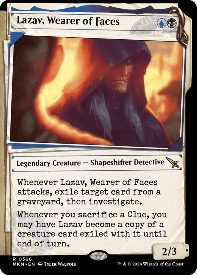 Whenever Lazav attacks, exile target card from a graveyard, then investigate. (Create a Clue token. It's an artifact with "{2}, Sacrifice this token: Draw a card.") Whenever you sacrifice a Clue, you may have Lazav become a copy of a creature card exiled with it until end of turn.