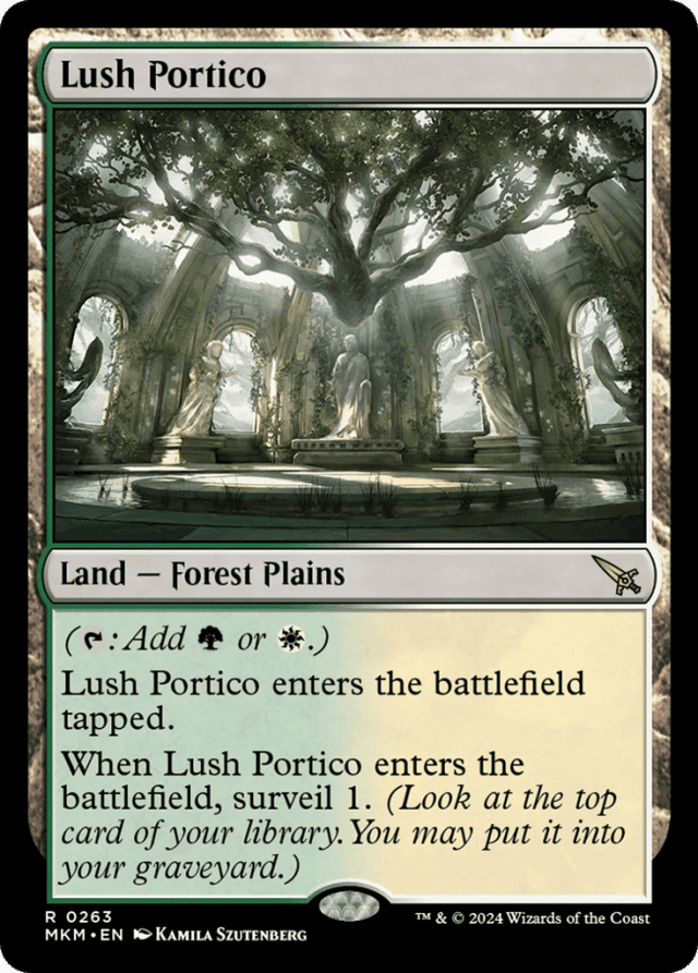 ({T}: Add {G} or {W}.) This land enters tapped. When this land enters, surveil 1. (Look at the top card of your library. You may put it into your graveyard.)