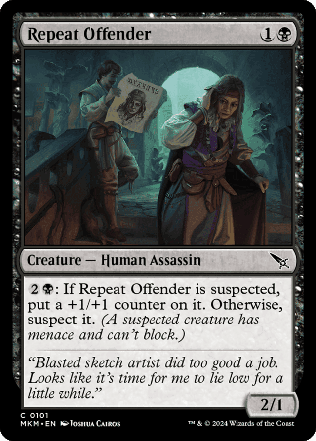 {2}{B}: If this creature is suspected, put a +1/+1 counter on it. Otherwise, suspect it. (A suspected creature has menace and can't block.)