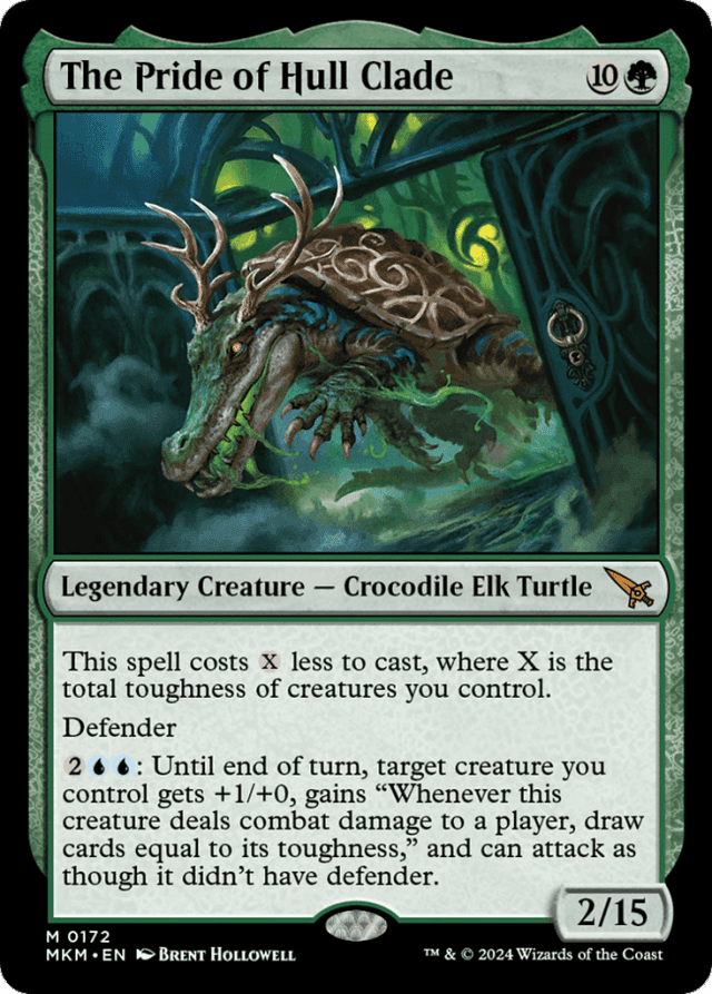 If the target of The Pride of Hull Clade's last ability deals combat damage to a player but leaves the battlefield before the granted triggered ability resolves, use its toughness as it last existed on the battlefield to determine how many cards to draw. — Once you announce you're casting a spell, no player may take actions until the spell has been paid for. Notably, opponents can't try to reduce the total toughness of creatures you control. — Once you determine the cost to cast The Pride of Hull Clade, you may activate mana abilities to pay that cost. If the total toughness of creatures you control changes while activating mana abilities, the cost to cast The Pride of Hull Clade remains what you previously determined. — The Pride of Hull Clade's cost reduction ability can't reduce the total cost to cast the spell below {G}. — The Pride of Hull Clade's mana value doesn't change no matter what the total toughness of creatures you control is. — The first step of casting a spell is to move it to the stack. If this causes the total toughness of creatures you control to change (perhaps because you control a creature whose toughness is determined by the number of cards in your hand), that new toughness will be used to determine the cost reduction.