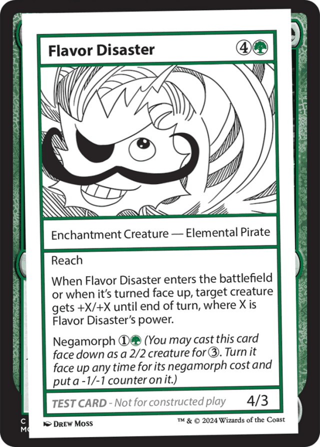 Any time you have priority, you may turn the face-down creature face up by revealing what its negamorph cost is and paying that cost. This is a special action. It doesn’t use the stack and can’t be responded to. Only a face-down permanent can be turned face up this way; a face-down spell cannot. — As a permanent with negamorph is turned face up, put a -1/-1 counter on it if its negamorph cost was paid to turn it face up. If it’s turned face up in any other way than paying its negamorph cost, you won’t put a -1/-1 counter on it. — For many playtest cards, you’ll need to make a generous assumption that basic game rules would be updated to allow them to work. The Mystery Booster 2 Playtest Card Notes section (reproduced here in individual Gatherer rulings) provides guidance for fitting these cards into the existing rules structure. — If Flavor Disaster is no longer on the battlefield when its second ability resolves, use its power as it last existed on the battlefield to determine the value of X. — Negamorph is a variant of the morph ability. A negamorph ability lets you cast a card face down by paying {3} and announcing that you are casting it face down using a morph ability. Any time you have priority, you can turn a face-down permanent with negamorph face up by paying its negamorph cost. — Playtest cards aren’t legal for play in any tournament format other than Mystery Booster Limited formats. On the other hand, we expect they will spice up a wide variety of non-tournament games (as long as everyone’s on the same page about using them!). — Playtest cards use a modified version of game symbols, such as {T} and {W}. These modified symbols should be treated as the standard symbols during play. — The creature spell is a 2/2 creature spell that has no name, mana cost, or creature types. The resulting creature is a 2/2 creature that has no name, mana cost, or creature types. Both the spell and the resulting creature are colorless and have a mana value of 0. Other effects that apply to the spell or creature can still grant it any characteristics it doesn’t have or change the characteristics it does have. — The face-down spell has no mana cost and has a mana value of 0. When you cast a face-down spell, put it on the stack face down so no other player knows what it is, and pay {3} to cast it. This is an alternative cost. — The value of X is determined only once, as Flavor Disaster’s second ability resolves.