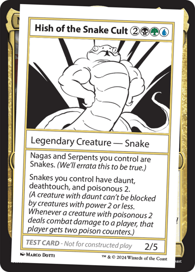 Nagas and Serpents you control are Snakes. (We'll errata this to be true.) Snakes you control have daunt, deathtouch, and poisonous 2. (A creature with daunt can't be blocked by creatures with power 2 or less. Whenever a creature with poisonous 2 deals combat damage to a player, that player gets two poison counters.)