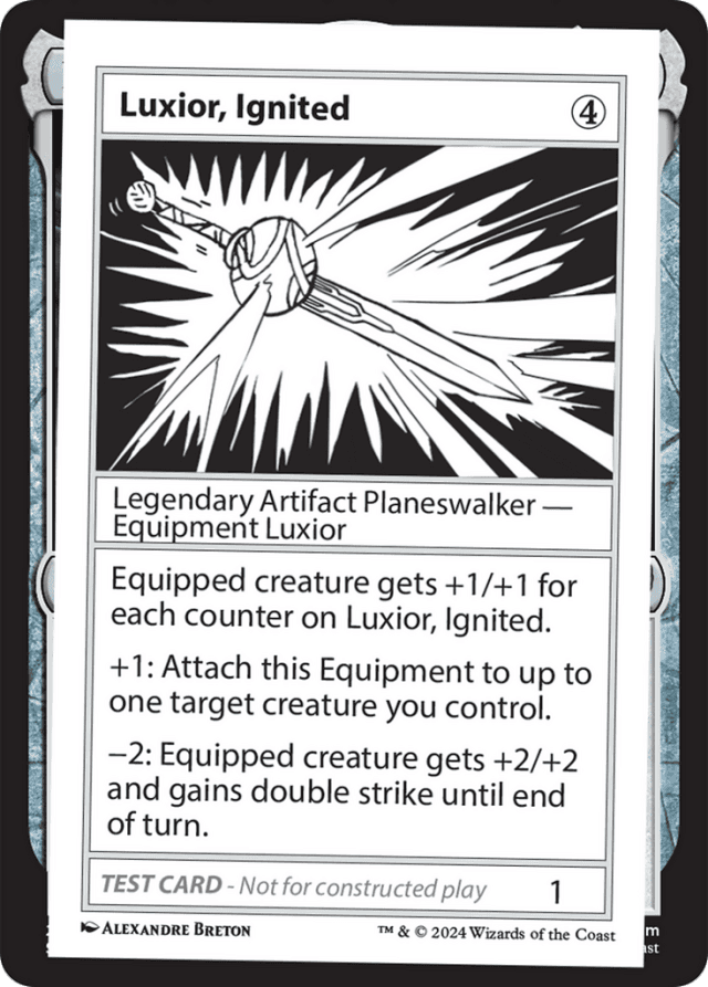 Equipped creature gets +1/+1 for each counter on Luxior, Ignited. [+1]: Attach this Equipment to up to one target creature you control. [−2]: Equipped creature gets +2/+2 and gains double strike until end of turn.