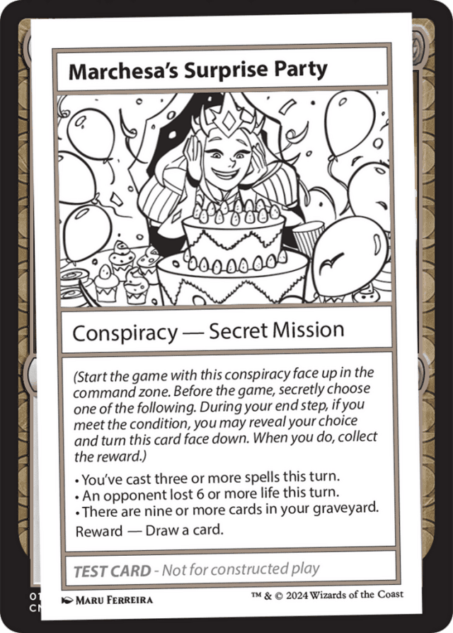 (Start the game with this conspiracy face up in the command zone. Before the game, secretly choose one of the following. During your end step, if you meet the condition, you may reveal your choice and turn this card face down. When you do, collect the reward.) • You've cast three or more spells this turn. • An opponent lost 6 or more life this turn. • There are nine or more cards in your graveyard. Reward — Draw a card.