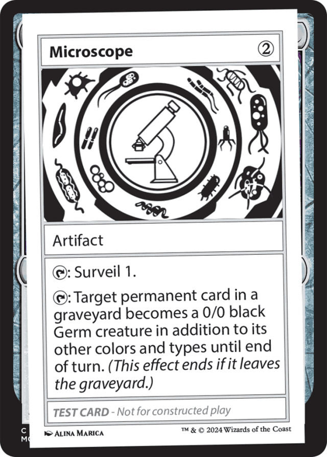 {T}: Surveil 1. {T}: Target permanent card in a graveyard becomes a 0/0 black Germ creature in addition to its other colors and types until end of turn. (This effect ends if it leaves the graveyard.)