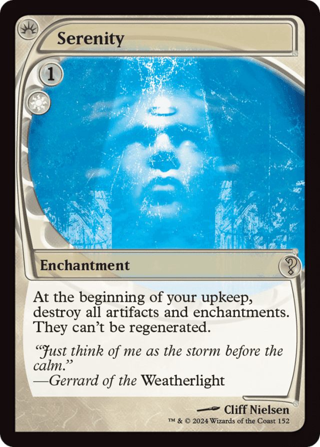 At the beginning of your upkeep, destroy all artifacts and enchantments. They can't be regenerated.
