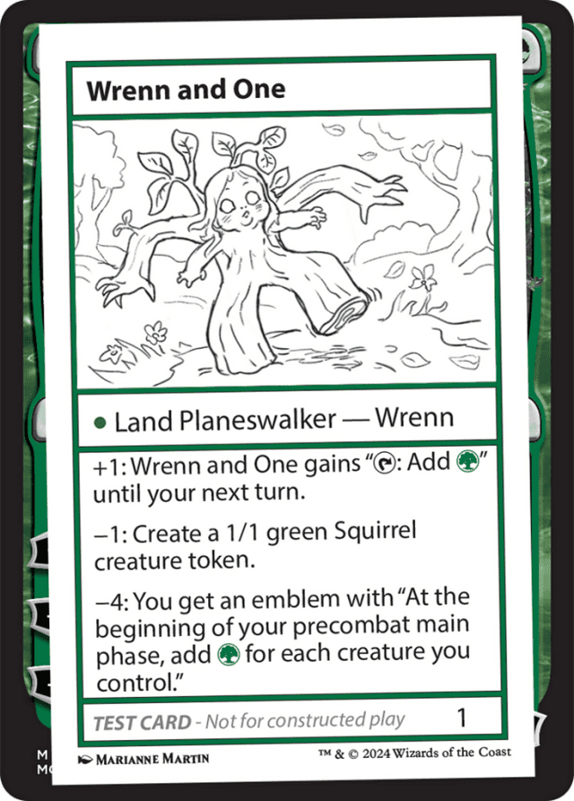 Due to its color indicator (appearing to the left of its type line), Wrenn and One is green. Color indicators apply in all zones, not just the battlefield. — For many playtest cards, you’ll need to make a generous assumption that basic game rules would be updated to allow them to work. The Mystery Booster 2 Playtest Card Notes section (reproduced here in individual Gatherer rulings) provides guidance for fitting these cards into the existing rules structure. — If Wrenn and One gains flash, or you have the ability to play Wrenn and One as though it had flash, you can ignore the normal timing rules for when during your turn you can play a land, but not any other restrictions. You can’t play Wrenn and One during another player’s turn, and you can’t play Wrenn and One if you don’t have any land plays remaining. — If Wrenn and One is changed into a basic land type, it continues to be a green Wrenn planeswalker, but it will lose its other abilities. — Playtest cards aren’t legal for play in any tournament format other than Mystery Booster Limited formats. On the other hand, we expect they will spice up a wide variety of non-tournament games (as long as everyone’s on the same page about using them!). — Playtest cards use a modified version of game symbols, such as {T} and {W}. These modified symbols should be treated as the standard symbols during play. — Wrenn and One is played as a land. It doesn’t use the stack, it’s not a spell, it can’t be responded to, it has no mana cost, and it counts as your land play for the turn. — Wrenn is a planeswalker type, not a land type.