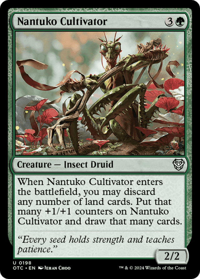 If an effect modifies how many +1/+1 counters you put on Nantuko Cultivator, the number of cards you draw isn't modified. Likewise, if an effect modifies how many cards you draw, the number of +1/+1 counters you put on Nantuko Cultivator won't be modified. — You discard, put counters, and draw all while Nantuko Cultivator's ability is resolving. Nothing can happen between the three, and no player may choose to take actions.