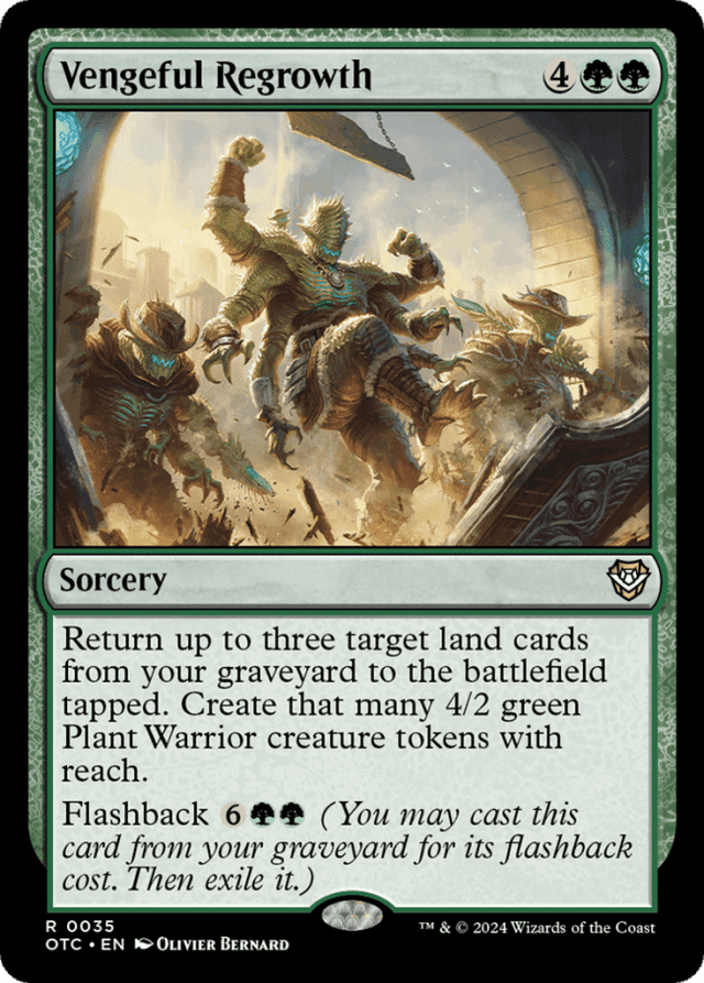 Return up to three target land cards from your graveyard to the battlefield tapped. Create that many 4/2 green Plant Warrior creature tokens with reach. Flashback {6}{G}{G} (You may cast this card from your graveyard for its flashback cost. Then exile it.)