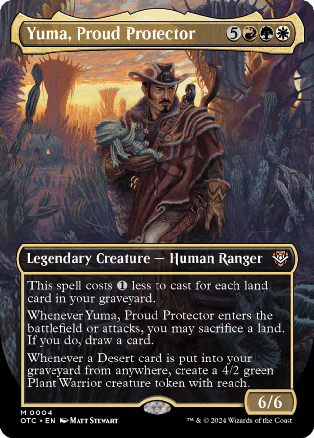 This spell costs {1} less to cast for each land card in your graveyard. Whenever Yuma enters or attacks, you may sacrifice a land. If you do, draw a card. Whenever a Desert card is put into your graveyard from anywhere, create a 4/2 green Plant Warrior creature token with reach.