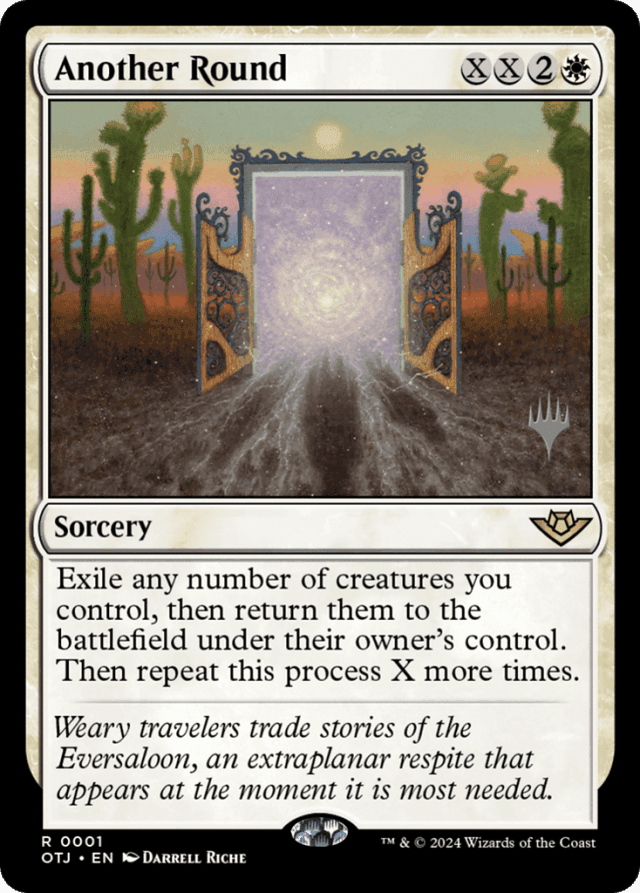 Abilities that trigger “When [this creature] enters the battlefield” or “When [this creature] leaves the battlefield” will trigger each time that creature enters or leaves the battlefield as a result of Another Round’s effect. If those abilities require targets, you won’t choose those targets until after Another Round finishes resolving, when those abilities are put onto the stack. — All abilities that trigger while Another Round is resolving are put on the stack after Another Round is finished resolving. All such abilities controlled by the player whose turn it is are put on the stack first, then those controlled by the next player in turn order, and so on. For each player, they can put their abilities on the stack in the order of their choice. Abilities don’t have to be put on the stack in the order in which they triggered. — If X is 0, you’ll perform the process just once when Another Round resolves. — If a token is exiled this way, it will cease to exist and won’t return to the battlefield. — Once an exiled creature returns, it’s considered a new object with no relation to the object that it was. Auras attached to the exiled creature will be put into their owners’ graveyards. Equipment attached to the exiled creature will become unattached and remain on the battlefield. Any counters on the exiled creature will cease to exist. — You don’t have to choose the same set of creatures each time you repeat this process.