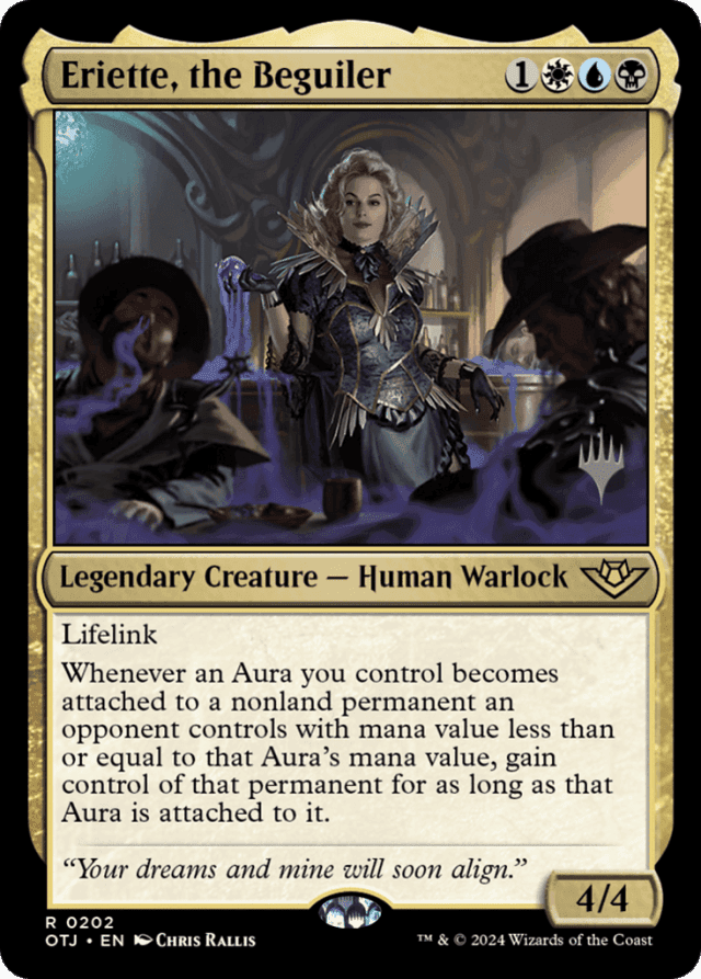If the Aura you control becomes unattached from a nonland permanent (most likely because the Aura left the battlefield) before Eriette’s triggered ability resolves, you won’t gain control of that nonland permanent at all. — If the mana cost of a permanent includes {X}, X is 0 for the purpose of determining its mana value.