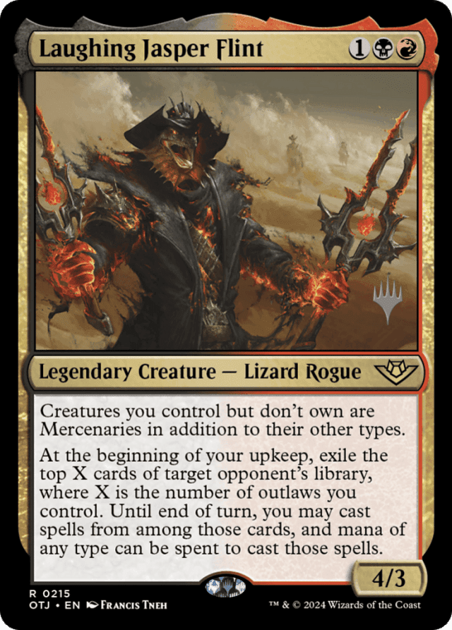 A card, spell, or permanent is an outlaw if it has the Assassin, Mercenary, Pirate, Rogue, or Warlock creature type. It doesn’t matter if it has more than one of those creature types; as long as it has at least one, it’s an outlaw. — If an ability refers to an outlaw or whether a player controls an outlaw, it’s referring only to permanents with one or more of the creature types specified above. Notably, it’s not referring to any spell or card not on the battlefield. However, other abilities may refer to an “outlaw spell” or “outlaw card” in a zone other than the battlefield. Those abilities refer to spells and cards with one or more of the specified creature types. — Laughing Jasper Flint’s first ability applies to creatures you control but don’t own as they enter the battlefield. For example, if you control Laughing Jasper Flint and Vial Smasher, Gleeful Grenadier, having a creature an opponent owns that normally isn’t an outlaw enter the battlefield under your control will cause Vial Smasher’s ability to trigger. — Outlaw is not a creature type. If an effect asks you to choose a creature type, you can’t choose outlaw. — The value of X is determined as Laughing Jasper Flint’s last ability resolves. — You pay all costs and follow all normal timing rules for cards played from exile with Laughing Jasper Flint’s last ability. For example, if you exile a creature card this way, you must wait until your main phase to cast it.
