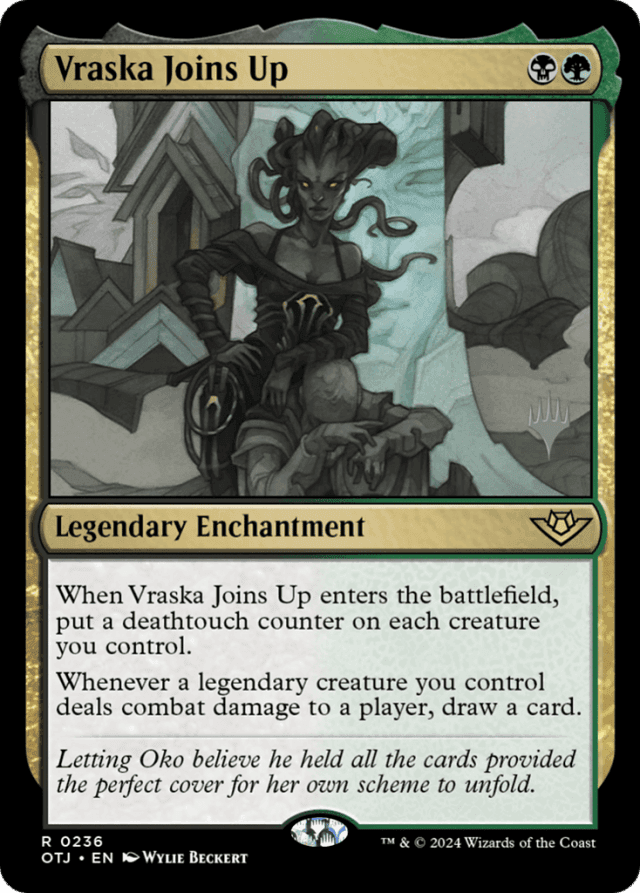 When Vraska Joins Up enters, put a deathtouch counter on each creature you control. Whenever a legendary creature you control deals combat damage to a player, draw a card.