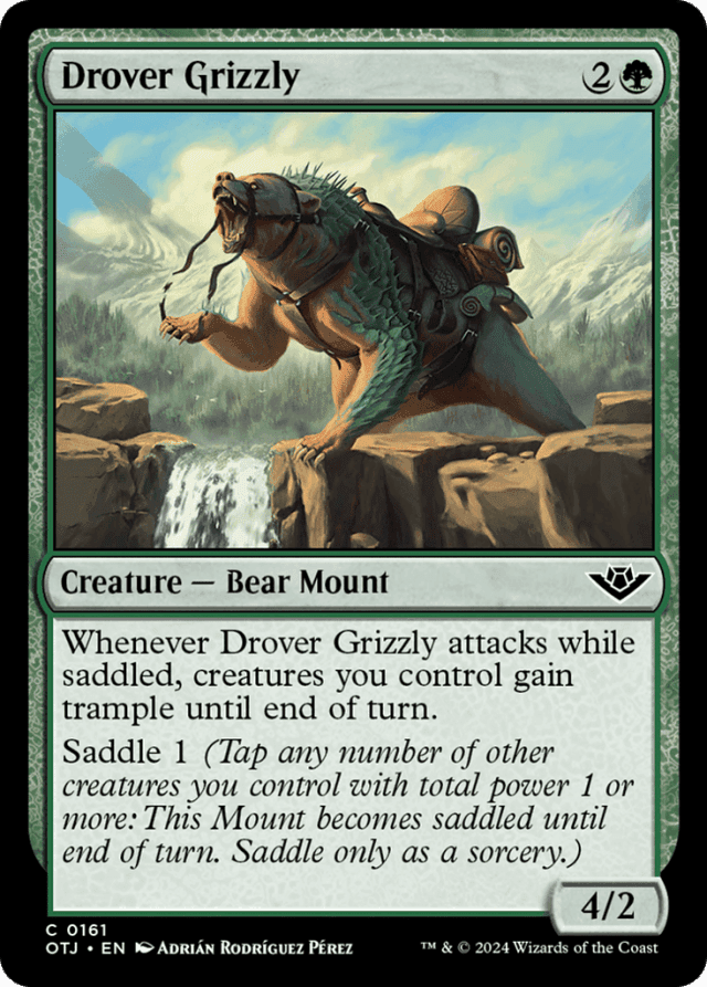 Whenever this creature attacks while saddled, creatures you control gain trample until end of turn. Saddle 1 (Tap any number of other creatures you control with total power 1 or more: This Mount becomes saddled until end of turn. Saddle only as a sorcery.)