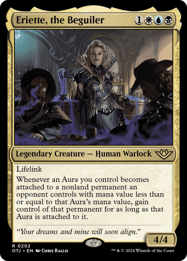 If the Aura you control becomes unattached from a nonland permanent (most likely because the Aura left the battlefield) before Eriette’s triggered ability resolves, you won’t gain control of that nonland permanent at all. — If the mana cost of a permanent includes {X}, X is 0 for the purpose of determining its mana value.