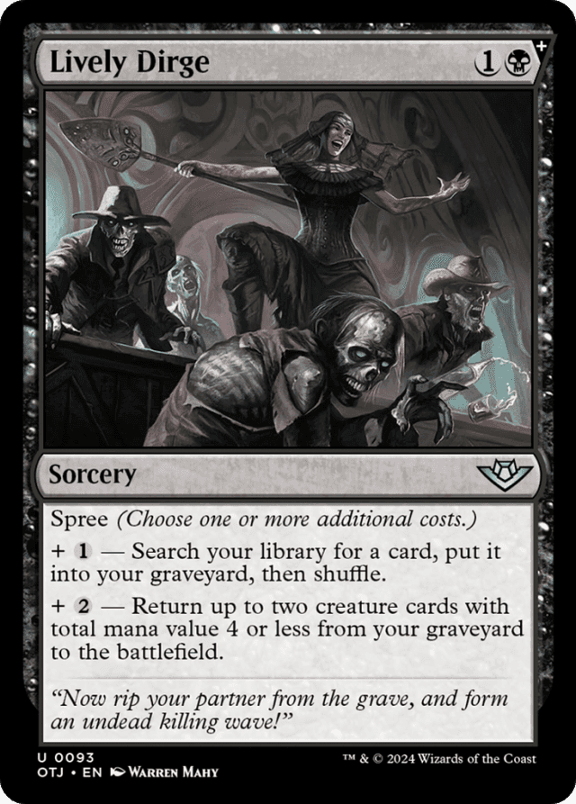 Each additional cost and associated mode in the text box is also preceded with a + indicator. These symbols also have no rules meaning and serve only to remind players that the listed costs are additional costs. — If a mode requires a target, you can select that mode only if there’s a legal target available. Ignore the targeting requirements for modes you don’t choose. — If a spell with spree is copied, the effect that creates the copy may allow you to choose new targets. You cannot choose new modes. — If all targets for the chosen modes become illegal before a spell with spree resolves, the spell won’t resolve and none of its effects will happen. If at least one target is still legal, the spell will resolve but will have no effect on any illegal targets. — If an effect allows you to cast a spell with spree “without paying its mana cost,” you must still choose at least one mode and pay the associated additional costs. — If the mana cost of a card in your graveyard includes {X}, X is 0 for the purpose of determining its mana value. — No matter which modes you choose, you always follow the instructions in the order they are written. — No player can cast spells or activate abilities in between the modes of a resolving spell. Any abilities that trigger won’t be put onto the stack until the spell is done resolving. — Spells with spree have a + (plus sign) indicator in the upper right corner of the card frame. This has no rules meaning and serves only to remind players that at least one additional cost is required to cast the spell. — The mana value of a spell with spree is determined only by its mana cost (in the upper right corner of the card). It doesn’t matter which modes you choose or which additional costs you pay, including any additional costs imposed by other effects. — The second mode doesn’t target any cards. You choose which ones you’re returning as Lively Dirge is resolving. You may choose the one you put into the graveyard with the first mode, if applicable, or ones that were already there. By the time Lively Dirge has started resolving, it’s too late for anyone to respond to it. — You can’t choose the same mode more than once. — You choose the modes as you cast the spell with spree. Once modes are chosen, they can’t be changed. — You must choose at least one of the listed modes and pay its associated additional cost in order to cast a spell with spree.