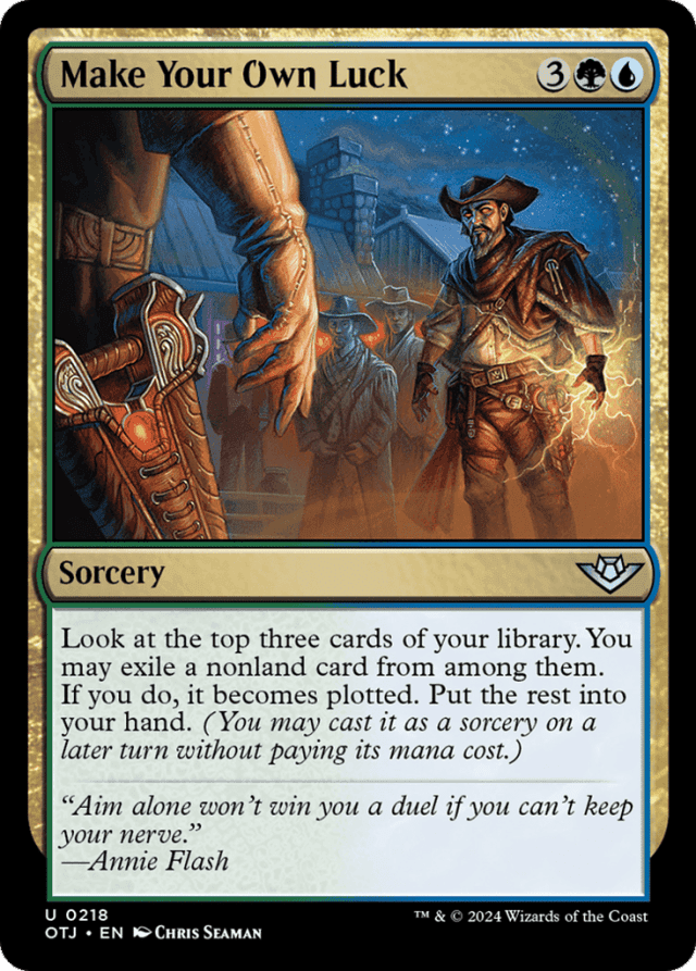 Exiling a card using its plot ability is a special action. Once you announce you're taking that action, no other player can respond by trying to remove that card from your hand. — If a plotted card has {X} in its mana cost, you must choose 0 as the value of X when casting it without paying its mana cost. — If there are fewer than three cards in your library, look at all of the cards in your library and follow the instructions in order. For example, if you had only two cards in your library, you would look at both, exile and plot up to one nonland card from among them, and then put the rest into your hand. Sounds like your luck is about to run out. — If you're casting a plotted card from exile without paying its mana cost, you can't choose to cast it for any other alternative costs. You can, however, pay additional costs, such as kicker costs. If the plotted card has any mandatory additional costs, those must still be paid to cast the spell. — Plot abilities are written "Plot [cost]," which means "Any time you have priority during your main phase while the stack is empty, you may pay [cost] and exile this card from your hand. It becomes plotted." — You can't cast a plotted card on the same turn it became plotted. On any future turn, you may cast that card from exile without paying its mana cost during your main phase while the stack is empty. — If an instant or a card with flash is plotted this way, you can still cast it only when you have priority during your main phase while the stack is empty.
