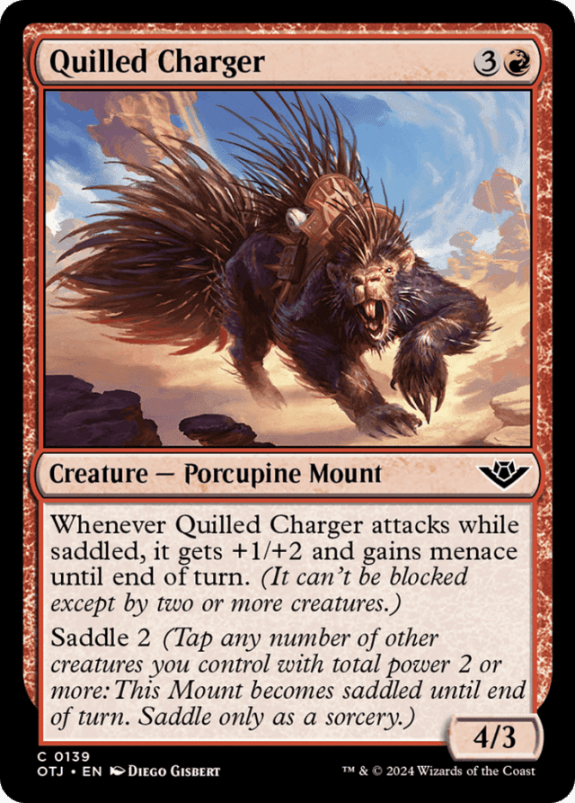 Whenever this creature attacks while saddled, it gets +1/+2 and gains menace until end of turn. (It can't be blocked except by two or more creatures.) Saddle 2 (Tap any number of other creatures you control with total power 2 or more: This Mount becomes saddled until end of turn. Saddle only as a sorcery.)