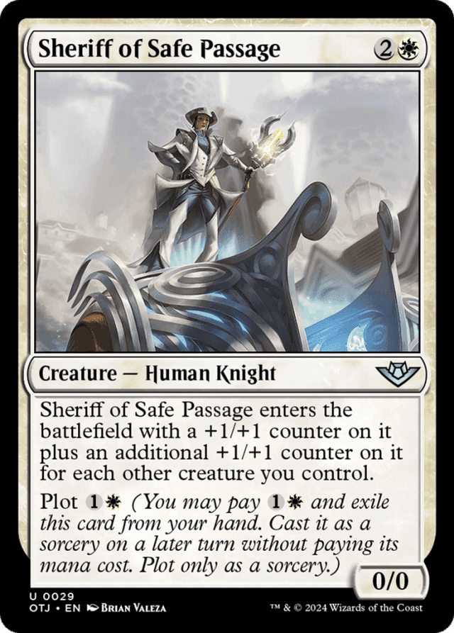 Exiling a card using its plot ability is a special action. Once you announce you’re taking that action, no other player can respond by trying to remove that card from your hand. — If Sheriff of Safe Passage enters the battlefield under your control at the same time as one or more other creatures, it doesn’t take those creatures into consideration when determining how many +1/+1 counters it enters the battlefield with. — If a plotted card has {X} in its mana cost, you must choose 0 as the value of X when casting it without paying its mana cost. — If you’re casting a plotted card from exile without paying its mana cost, you can’t choose to cast it for any other alternative costs. You can, however, pay additional costs, such as kicker costs. If the plotted card has any mandatory additional costs, those must still be paid to cast the spell. — Plot abilities are written “Plot [cost],” which means “Any time you have priority during your main phase while the stack is empty, you may pay [cost] and exile this card from your hand. It becomes plotted.” — You can’t cast a plotted card on the same turn it became plotted. On any future turn, you may cast that card from exile without paying its mana cost during your main phase while the stack is empty.