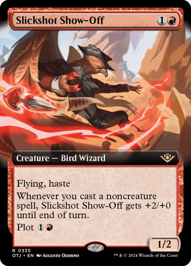 Flying, haste Whenever you cast a noncreature spell, this creature gets +2/+0 until end of turn. Plot {1}{R} (You may pay {1}{R} and exile this card from your hand. Cast it as a sorcery on a later turn without paying its mana cost. Plot only as a sorcery.)