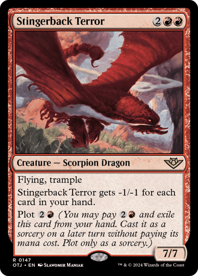 Because damage remains marked on a creature until it's removed as the turn ends, the damage Stingerback Terror takes during combat may become lethal if you draw cards later in the turn. — Exiling a card using its plot ability is a special action. Once you announce you're taking that action, no other player can respond by trying to remove that card from your hand. — If a plotted card has {X} in its mana cost, you must choose 0 as the value of X when casting it without paying its mana cost. — If a spell or ability causes you to draw cards and then has you remove some from hand (such as by discarding them or putting them on top of your library), Stingerback Terror may briefly have 0 toughness or less. As long as its toughness is 1 or greater again after the spell or ability is finished resolving, it will remain on the battlefield. — If you're casting a plotted card from exile without paying its mana cost, you can't choose to cast it for any other alternative costs. You can, however, pay additional costs, such as kicker costs. If the plotted card has any mandatory additional costs, those must still be paid to cast the spell. — Plot abilities are written "Plot [cost]," which means "Any time you have priority during your main phase while the stack is empty, you may pay [cost] and exile this card from your hand. It becomes plotted." — You can't cast a plotted card on the same turn it became plotted. On any future turn, you may cast that card from exile without paying its mana cost during your main phase while the stack is empty.