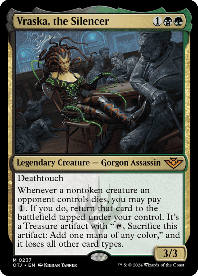Deathtouch Whenever a nontoken creature an opponent controls dies, you may pay {1}. If you do, return that card to the battlefield tapped under your control. It's a Treasure artifact with "{T}, Sacrifice this artifact: Add one mana of any color," and it loses all other card types.